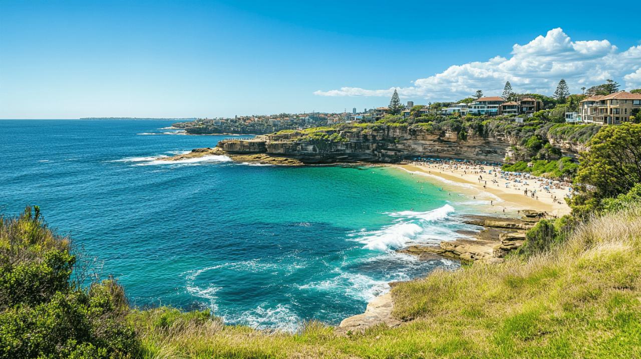 Votre périple débute à Bondi Beach, la plage la plus célèbre d'Australie, reconnaissable à son arc de sable doré et ses vagues prisées des surfeurs du monde entier. Ce lieu emblématique incarne parfaitement le mode de vie australien, entre sport, détente et culte du corps. En quittant Bondi, vous apercevrez rapidement le fameux Bondi Icebergs Club et sa piscine océanique spectaculaire, creusée à même la roche et régulièrement balayée par les vagues. Après environ une demi-heure de marche, vous atteindrez Tamarama Beach, surnommée affectueusement « Glamarama » par les locaux en raison de son ambiance branchée et de la beauté de ses habitués. Cette plage plus petite mais tout aussi charmante abrite le Tamarama Life Saving Club et un café où vous pourrez faire une première halte rafraîchissante.